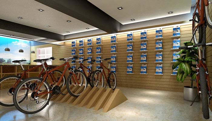 設計理念:設計師按照自行車專賣店的標準來設計,業主對奧城自行車店裝修設計的要求設計是風格大氣、簡潔、體現品牌形象。同時設計師參考同行業和根據行業特性自由發揮,主要涉及門頭、背景墻,前臺與展示架、整體的風格搭配。自行車展示。整體需要有品牌氣氛。