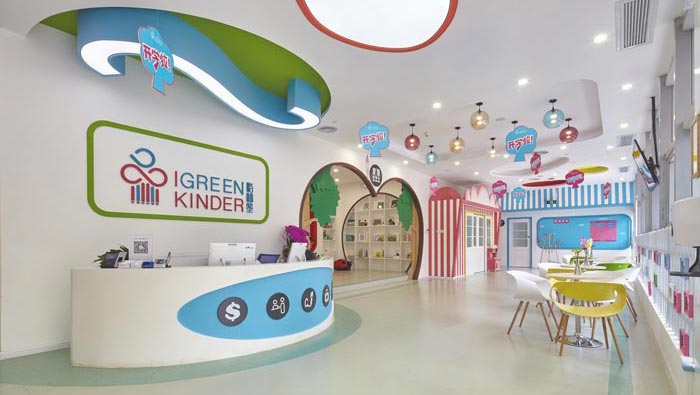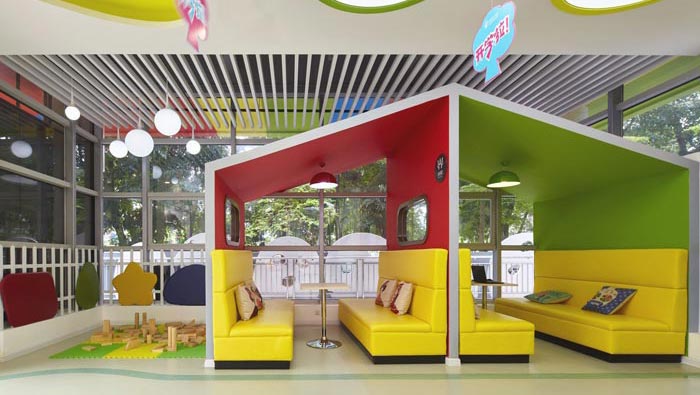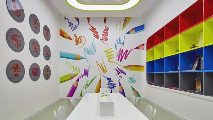 休息與洽談區的設計:此次位于前臺空間的左前方,目的就是希望此地承載起接待的作用,讓客戶在此處可以感受到企業的辦學理念,空間的色彩設計師以活潑、鮮艷為主,同時空間格局以半開放式的形式展現出來,同時簡易的小房子模型也給客戶一種家的感覺,積木的堆砌為孩子提供了一個玩耍的區域。