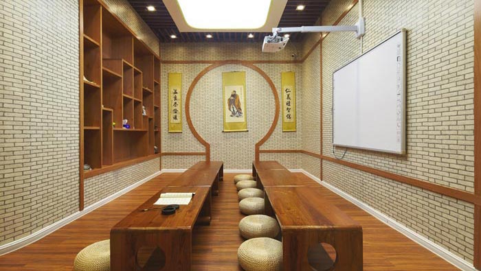 古學區域的設計:此處可以容納12位學員,此處的目的不在于學習,而在于培養孩子學習的興趣,讓孩子們從小就對古代圣賢有一個直接的了解,為未來的學習奠定基礎,孔子是中國歷史上偉大的教育家、思想家,設計師希望孩子可以從小去熟悉他,并以他為榜樣不斷進步、不斷學習、不斷自勉。