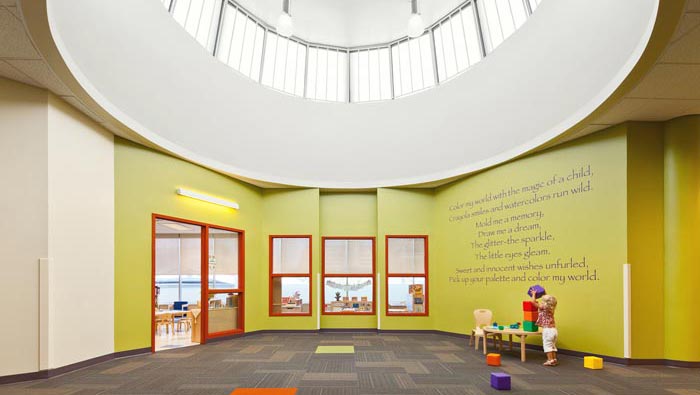 休息區域的設計:此處與教室的格局類似,但功能卻不同,此處是孩子的個人時間,在設計師看來每一個孩子都需要有自己的時間,讓孩子們自己去安排,我們不能扼殺孩子的天性,因為有時候我們做的一切不一定對孩子有好處,所有需要這樣一個空間,讓孩子獨立自主的完成某項事物,只有如此才能讓孩子不斷成長。
