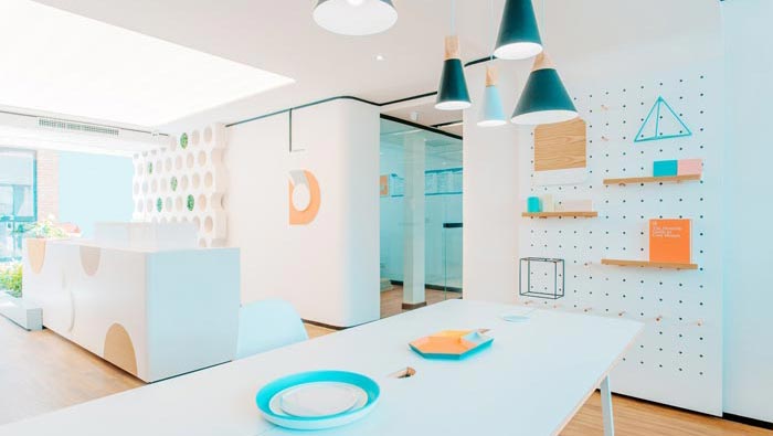 前臺區域的設計:設計師在設計的時候,采用白色做為主色調,其中加入了藍色、褐色等各種色彩,白色為主色調給人一種溫暖、明亮的感覺,其他顏色做為點綴之用,白色本身就有向外散發的屬性,可以在一定程度上提升空間的視覺感受。