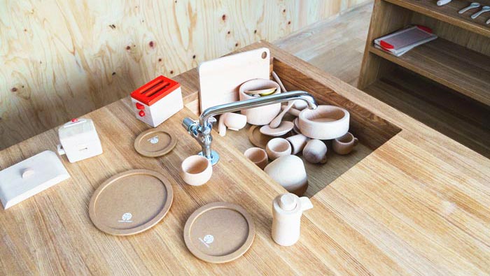 洗手池的設計:通過這里可以看出設計師對于孩子安全的關心,木質材料做成的桌子、餐具、勺子,保證了孩子的安全,同時十分衛生,讓孩子們在這樣可以快樂、健康的成長,讓孩子在不斷在實踐中成長自身,從小培養孩子實踐的習慣,這會讓孩子一生都受益終生。